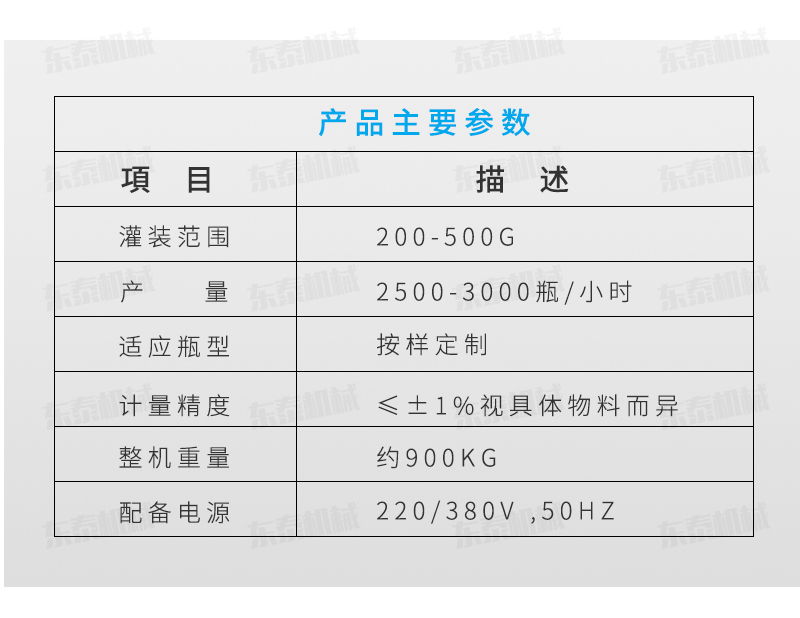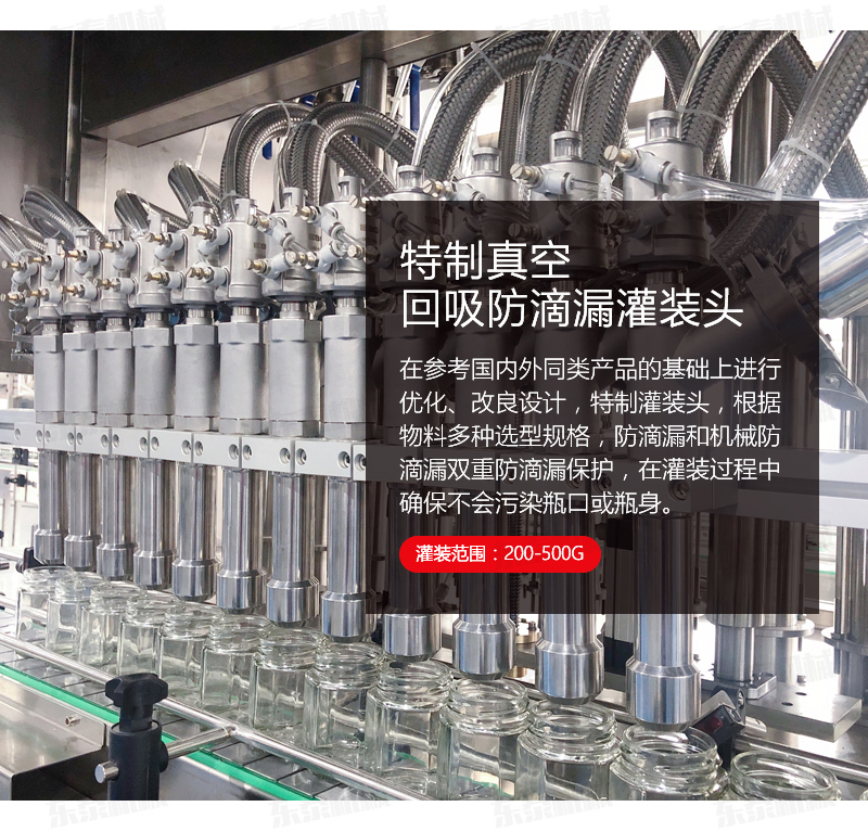3、灌装机采用横推料的方式,大大缩短了下料斗到灌装头的距离,提高了灌装速度,更重要的是解决了含油量大的物料在灌装过程中出现的有些瓶油多,有些瓶酱多的灌装难题,大大提高了灌装精度。