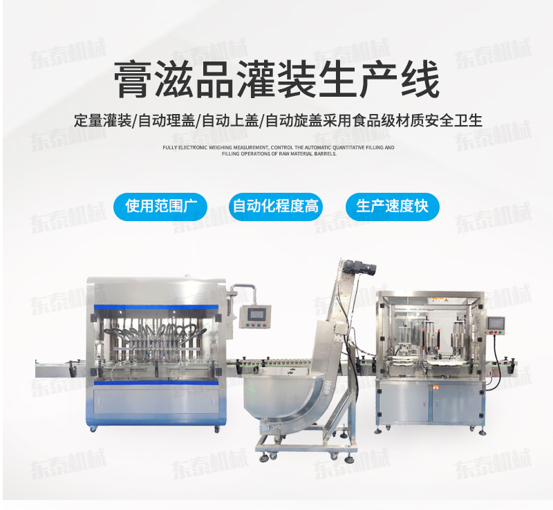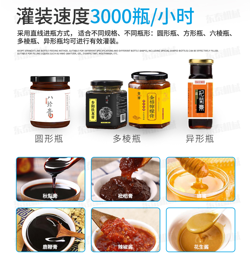 枇杷膏灌装机生产线适用于各种1、各种膏滋如:秋梨膏、枇杷膏、鹿鞭膏、蜂蜜等的灌装。2、调味酱如:香菇酱、辣椒酱、豆瓣酱、花生酱、芝麻酱、牛油火锅底料、红油火锅底料。3、采用多规格的灌装转阀、灌装头,可适应不同客户物料的灌装需求。