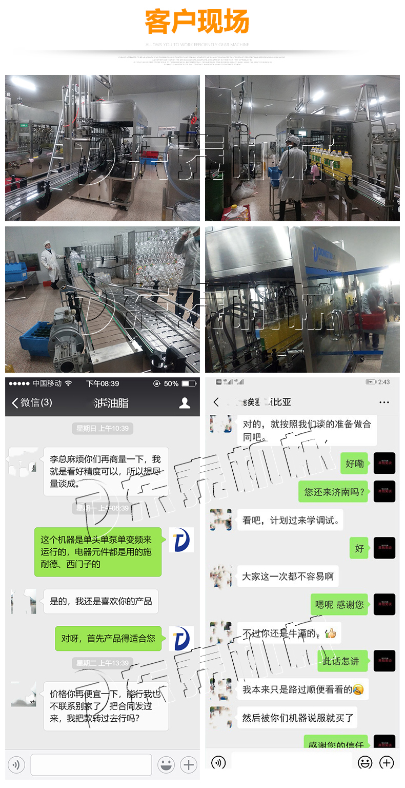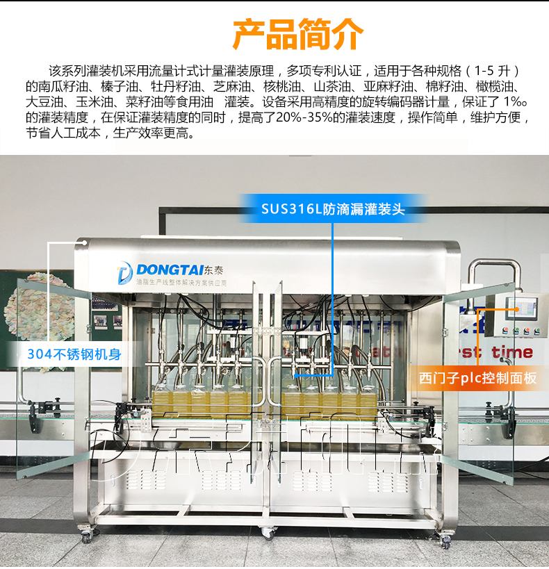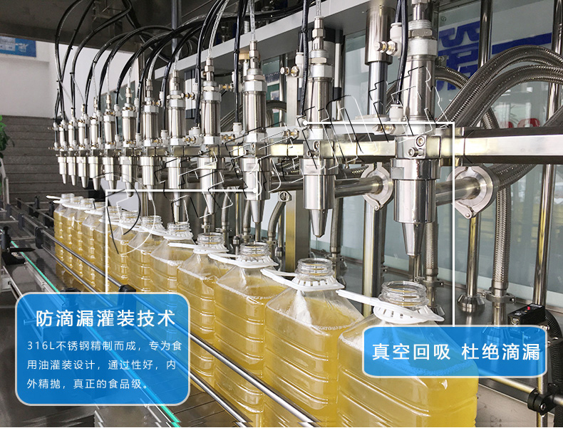 该3000瓶食用油灌装生产线采用流量计式计量灌装原理,多项认证,适用于各种规格(1-5升)的南瓜籽油、榛子油、牡丹籽油、芝麻油、核桃油、山茶油、亚麻籽油、棉籽油、橄榄油、大豆油、玉米油、菜籽油等食用油灌装。设备采用高精的旋转编码器计量,保证了1%o的灌装精度,在保证灌装精度的同时,提高了20%-35%的灌装速度,操作简单,维护方便,节省人工成本,生产效率更高。