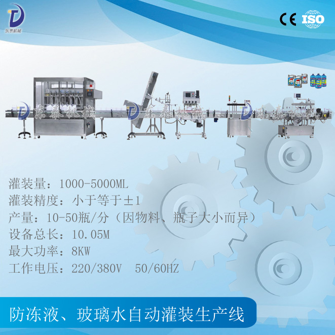 本设备专门针对润滑油、玻璃水、防冻液开发的自动化灌装设备,具有自动化程度高,精度高,灌装机采用特殊的防滴漏、放泡沫装置,整个生产线能自动完成灌装、上盖旋盖,铝箔封口,贴标功能。是玻璃水防冻液、润滑油灌装的首先设备。