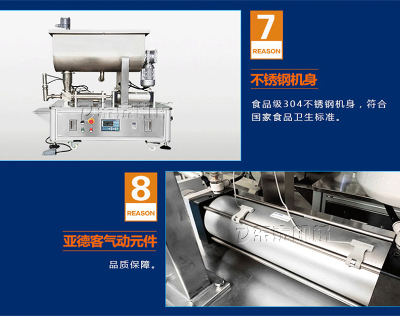 产品简介:半自动酱类酱料灌装机SFM系列结构合理、机型小巧、性能可靠、定量准确、操作方便。整机304不锈钢,灌装闷头防漏料防滴油,气缸驱动结构,加大200L料斗,品牌全铝壳铜芯大功率搅拌电机,变频调速,PLC智能控制,用户可根据需要任意调节灌装量及灌装速度,灌装精度高。