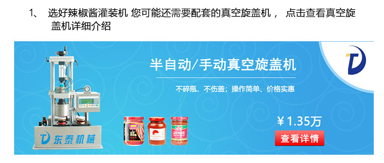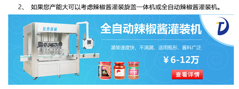 适用范围:小型辣椒酱灌装机主要适用于那些含颗粒的颗粒浆状流体、半流体、膏体、酱状类的物料灌装,各种匀质酱料、火锅底料、老干妈辣椒酱、干煸牛肉酱、泡椒、牛肉粒酱、香菇丁酱、八宝菜、萝卜丁、含干煸腊肉丁、辣子鸡丁、油炸花生等大颗粒、含油量少等干煸辣椒酱的灌装。