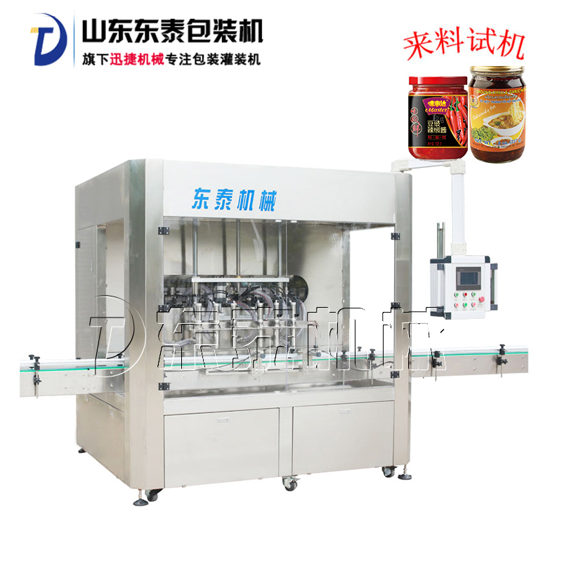 产品简介: 全自动辣椒酱类酱体灌装生产线是集光、机、电、气于一体,采用活塞式定量原理,灌装精度高、操作简单、维护方便。设备主要材质:采用SUS304不锈钢制造真正的食品级,灌装采用压力式灌装,无需配装高位罐,简化了安装工序,提高了灌装效率。可广泛应用于食品、酱料行业产品的自动化包装生产。