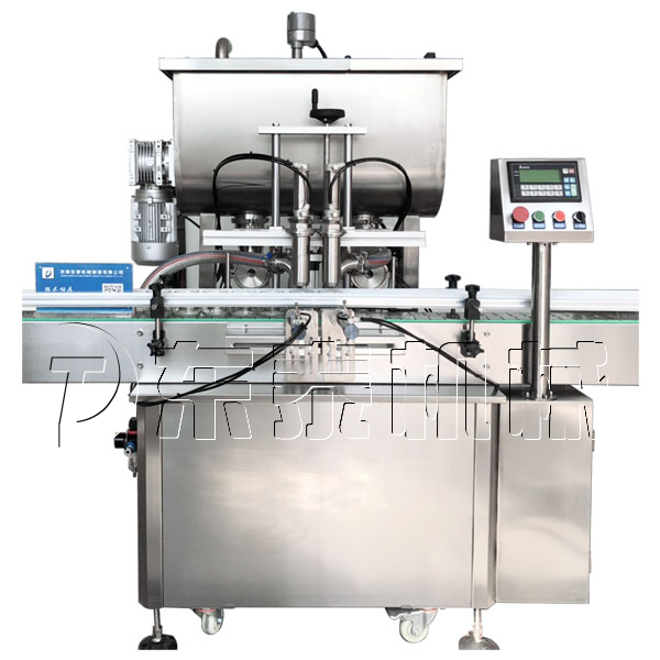 3、该设备在设计上大大缩短了下料斗到灌装头的灌装距离,克服了含油量大的物料(如:含芝麻粒的辣椒油)在灌装过程中出现的有些瓶油多,有些瓶酱多的灌装误差大的缺点。