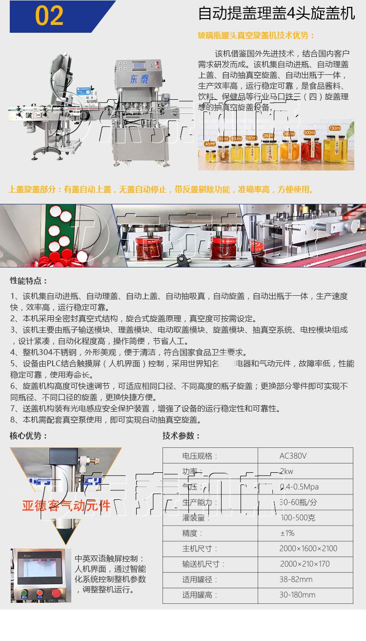 该机借鉴国外技术,结合国内客户需求研发而成。该机集自动进瓶、自动理盖上盖、自动抽真空旋盖、自动出瓶于一体,生产效率高,运行稳定可靠,是食品酱料、饮料、保健品等行业马口铁三(四)旋盖理想的抽真空旋盖设备。