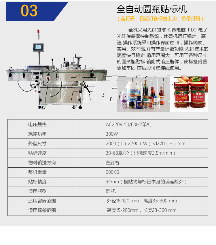 全机采用的技术,微电脑-PLC-电子光纤传感器控制系统,使整机运行稳定、高速 操作系统采用操作界面控制,操作简便、实用、效率高,并有产量记数功能 技术的速度快且稳定 适用范围大,可用于各种尺寸的圆形瓶贴标 输附式滚压瓶体,使标签附著更加牢固 前后段可选连线使用.