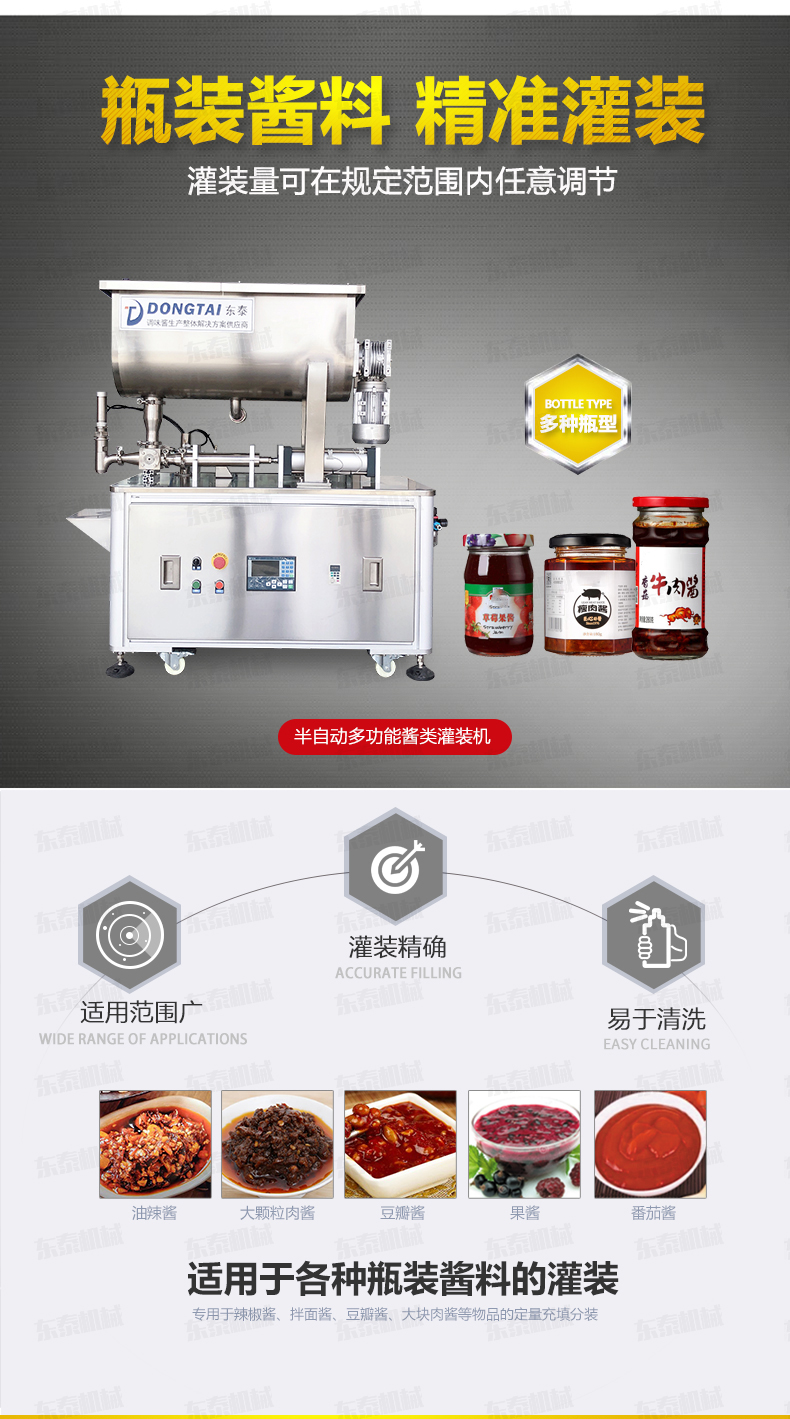 本单头酱料灌装机可自动完成计量、灌装等全过程,操作方便,该机为半自动灌装机械,配置的自动搅拌器,保证了酱和油的充分混合,可灌装颗粒浆状流体物料在对辣椒酱、拌面酱、豆鼓等酱类进行灌装时,灌装量可在规定范围内任意调节,计量误差小,该半自动酱类灌装机采用压缩空气为动力可在各种环境中使用。