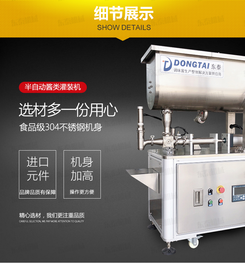 7.加高不锈钢机身:单头酱料灌装机机身整体加高,操作更方便,食品级304不锈钢机身,符合国家食品级卫生标准