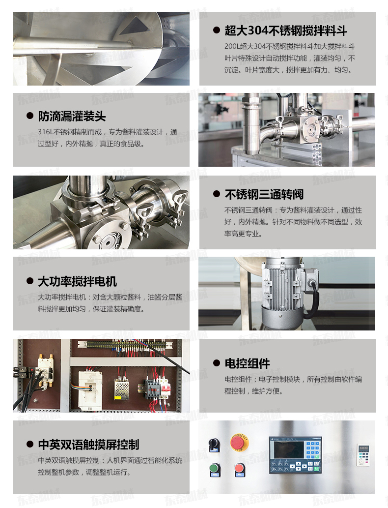 1.防滴漏灌装头 :316L不锈钢精制而成,专为酱料灌装设计,通过型好,内外精抛,真正的食品级