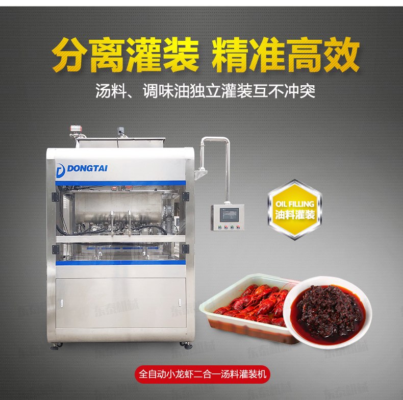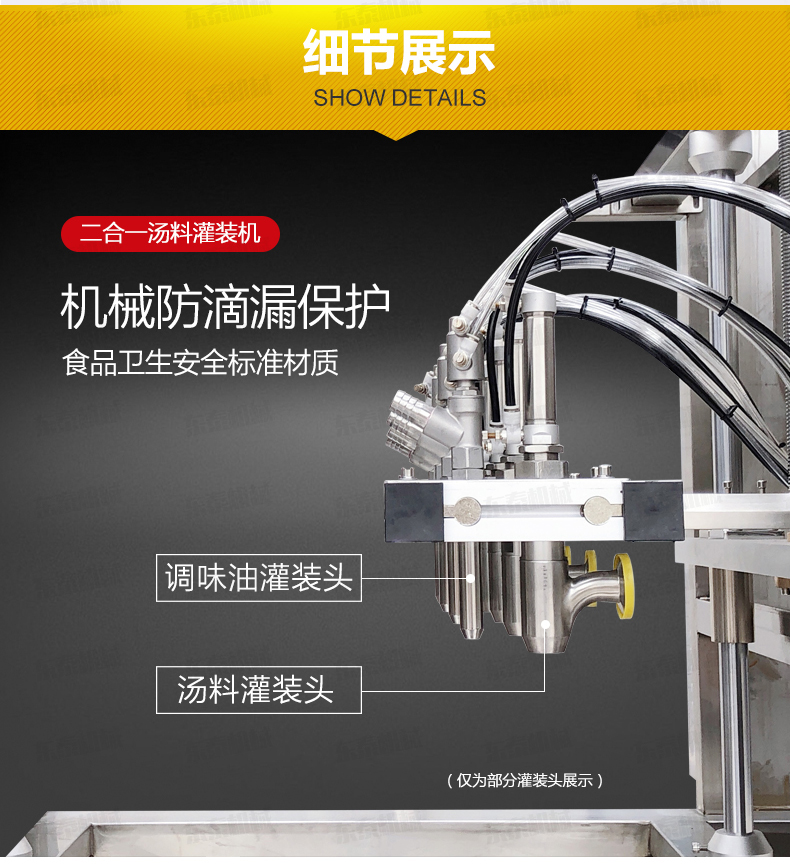 1.灌装机在参考国外同类产品的基础上进行改良设计,特制汤料、调味油灌装头,机械防滴漏保护,在灌装过程中不会污染包装容器。