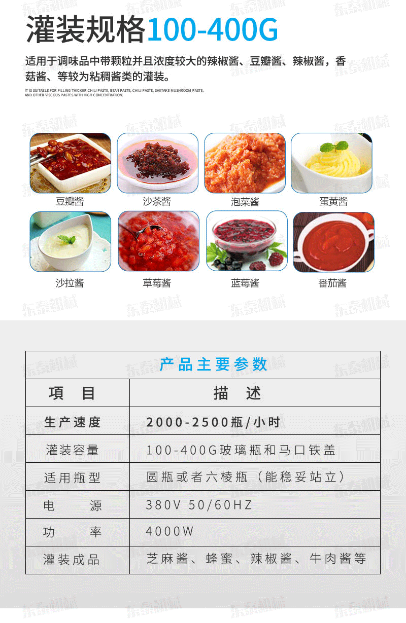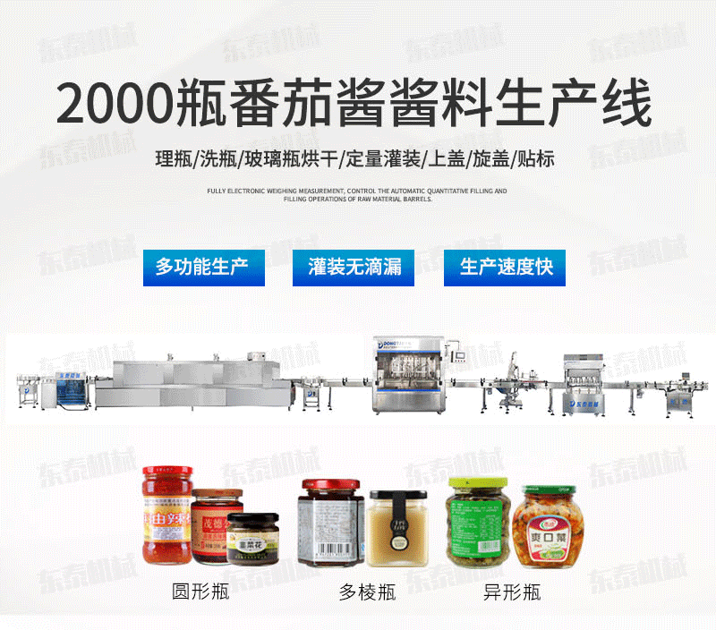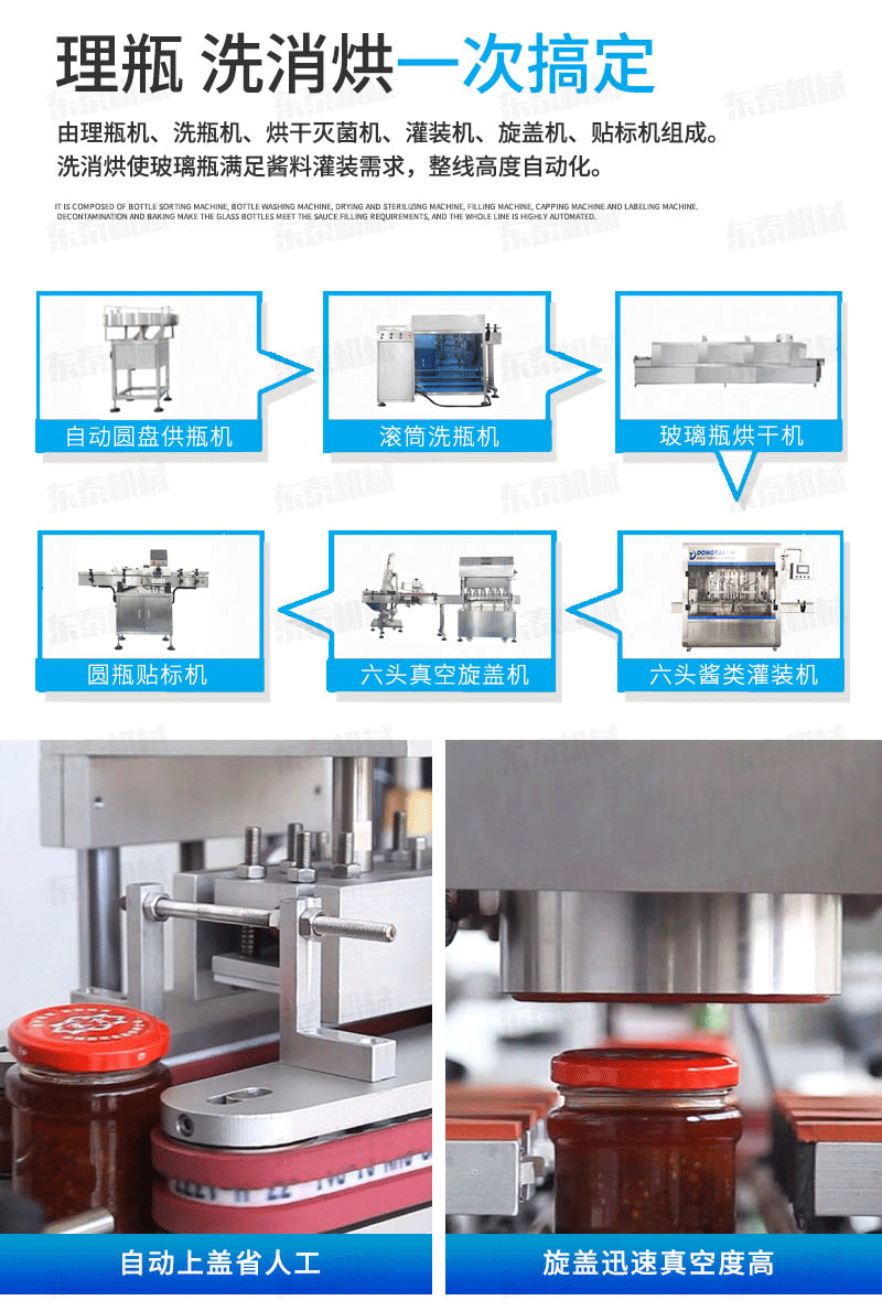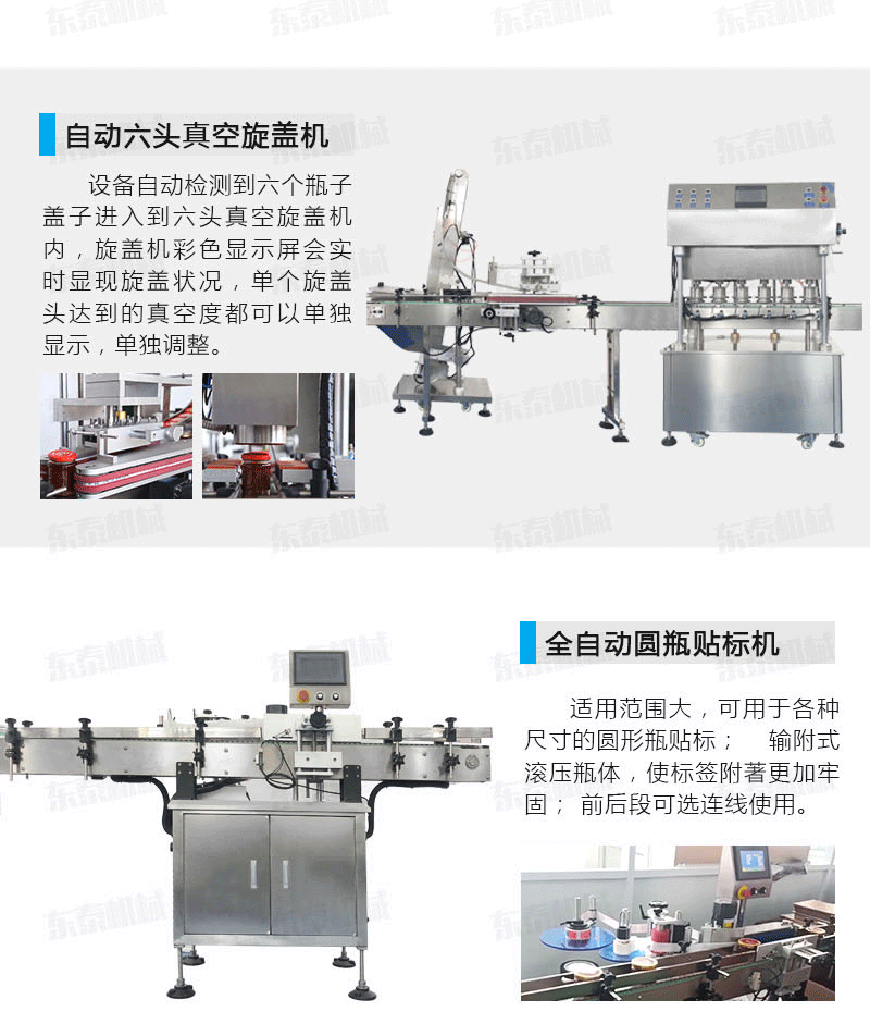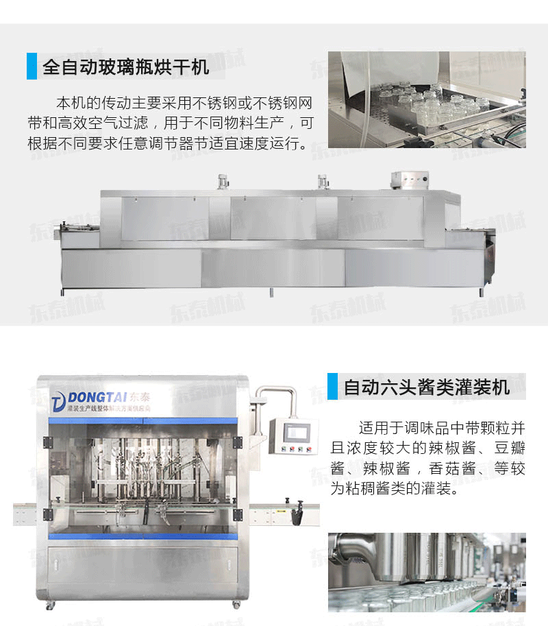 A、番茄酱灌装机生产线基础上进行改良设设计,酱料防滴防漏灌装头,在灌装过程中不污染瓶口及瓶身,方便后续的旋盖和贴标工序。