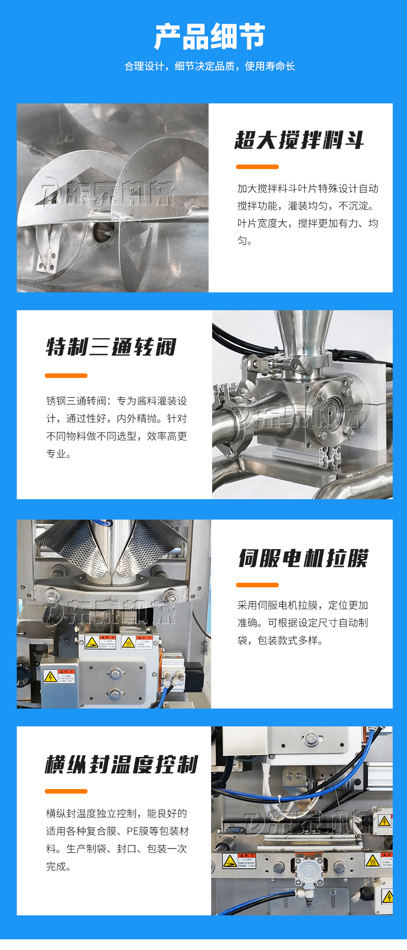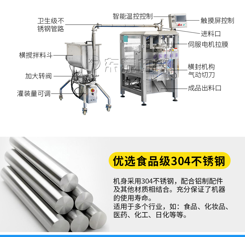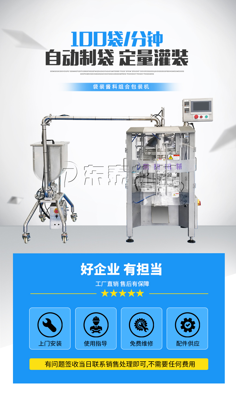 牛肉酱灌装包装机械主要用于调味品酱料的自动化包装,机器安装有横向螺带式搅拌,使油酱混合均匀,确保灌装精度和产品包装成品的均匀性。灌装计量设备安装有万向轮,管路链接均采用快拆接头,方便灌装机拆卸移动清洗。包装设备采用全伺服驱动器,包装速度快,运行稳定。