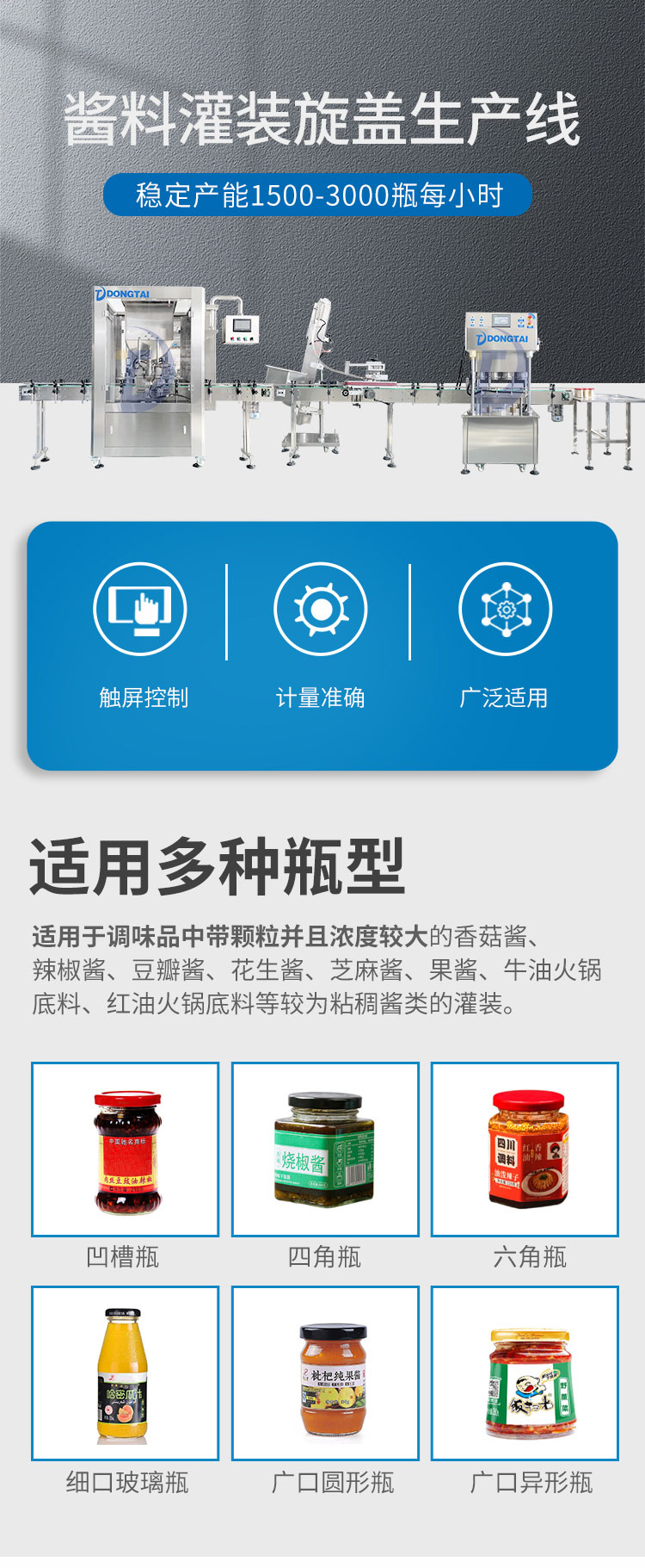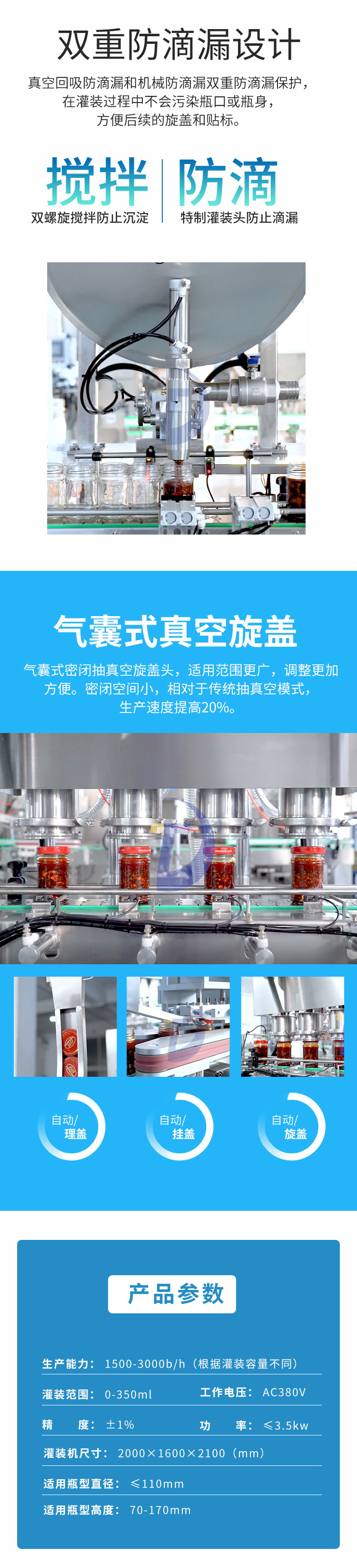 在不断地蜕变和进步的销售市场中,酱料灌装机以最新的发展理念向前,酱料灌装机并摆脱落后的管理机制,进而让自身加入到一种最新的进步天地。如今酱料灌装机凭借设计的优势和简单的操作达到销售市场的要,也是让其结构化繁为简,让商品制造有着更多的使用。关心自身能力的增强进而让粮食商品拥有更便捷的制造,进而为公司和销售市场产生更多的帮助,也为客户产生更多的帮助和便捷。达到自身能力的增强,进而再那样的制造中产生更多的新发展,并不断地增加创新技术的研制和资金投入,进而再那样快速向前的销售市场中为公司产生更多的便捷。