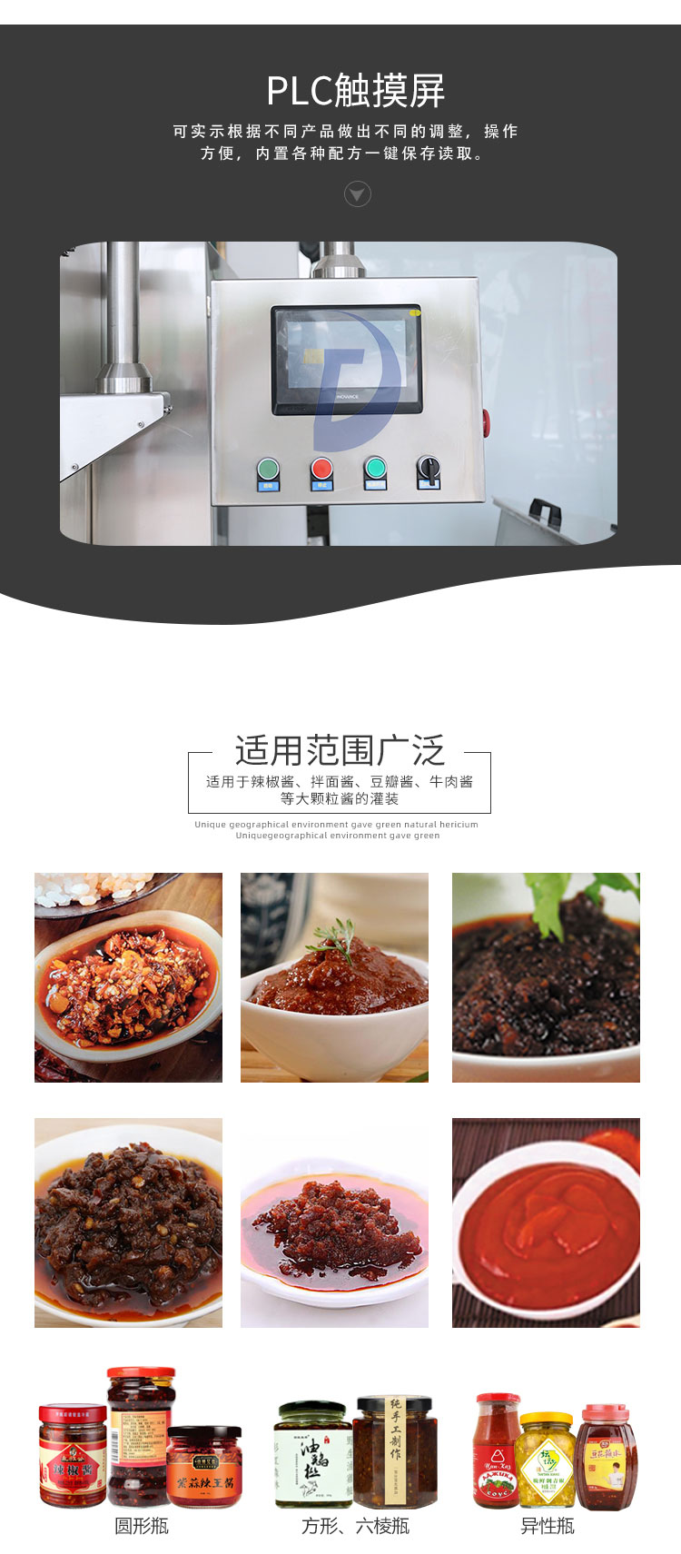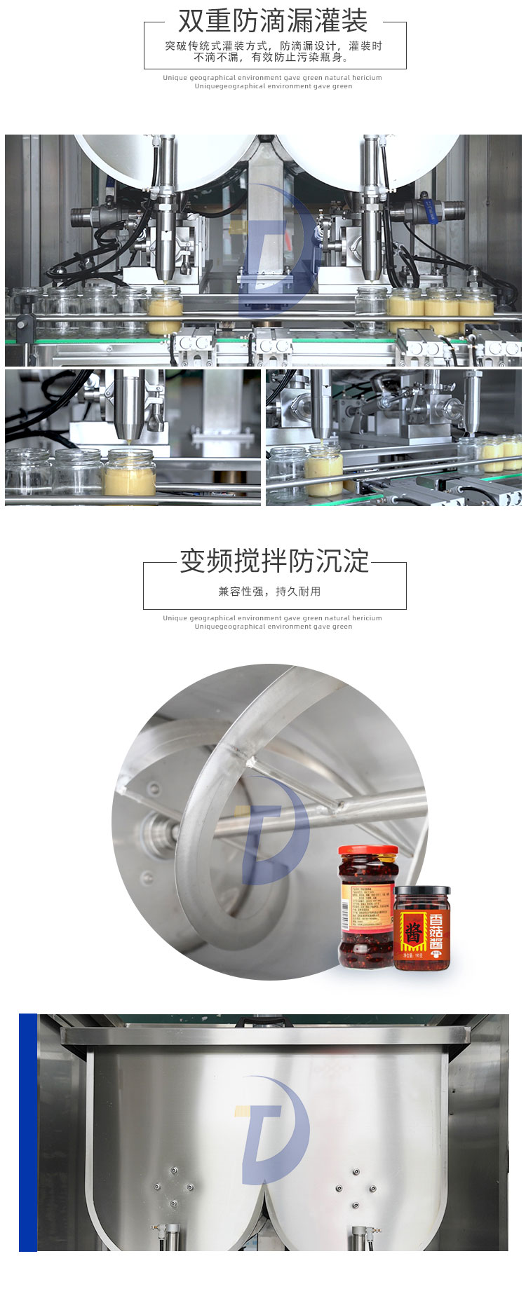 在现在的销售市场中可以这么说不管是怎么样的机器设备都是有属于自己的工业设备,而双头极速酱料灌装机顾名思义便是专业对于辣椒酱生产制造而存在的工业设备。而除开辣椒酱商品之外,可以这么说如果是酱料商品,不论是猪肉酱、芝麻酱、青椒酱、蒜蓉酱、豆瓣酱等各种酱料商品都可以运用双头极速酱料灌装机实现自动灌装、自行旋盖、自行抽真空、自动贴标等工作中,中后期还能够配上自动开箱机、胶带封箱机、自行折盖机等工业设备进行酱料商品销售的中后期装包工作中,为这些人带来更快的维护,让酱料商品可以保证质量、且更快的发生在销售市场中,并可以更快的提高公司的生产能力,因此获得大量厂家的肯定和喜爱。