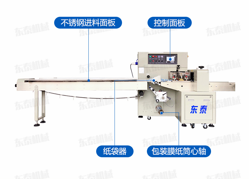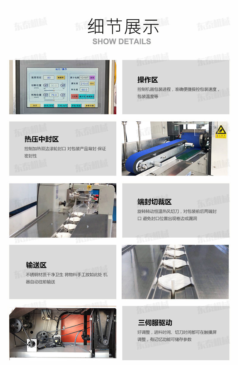 3、先进的微电脑包装控制器,优良的人机对话模式,使速度、袋长、切点位置检测等都可在界面上直接显示。 4、滑动式横封机构,可上下任意调整横封的中心高度。