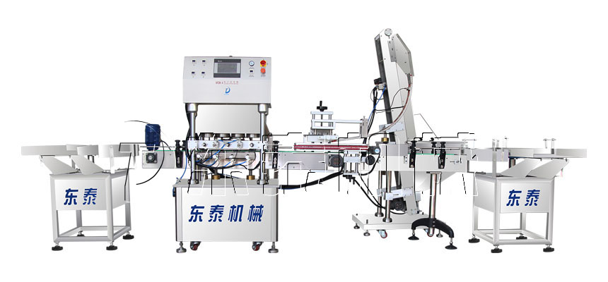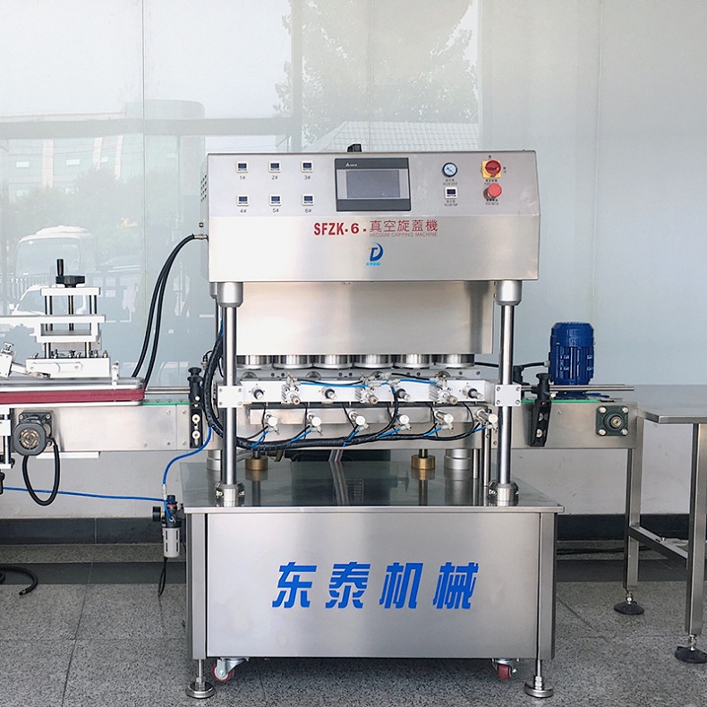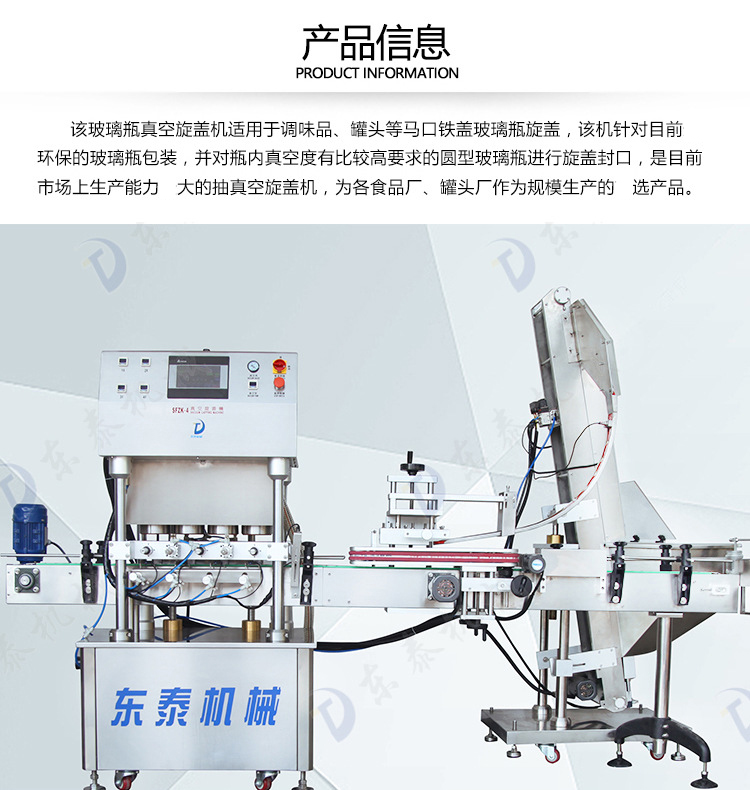 全自动直线式真空旋盖机适用于辣椒酱、香菇酱、罐头等瓶装酱类罐头的马口铁盖真空旋盖封口,自动化程度高。机器能完成自动灌装、自动取盖上盖,自动真空封盖封口。全自动直线式灌装旋盖机大大的减少人工费用,缩减机器占地面积,节约场地。