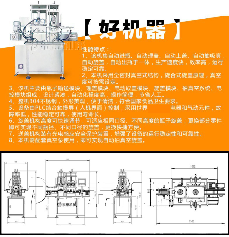 1.该机集自动进瓶、自动理瓶、自动上盖、自动抽真空、自动旋盖、自动出瓶于一体,生产速度快,效率高,运行稳定可靠。