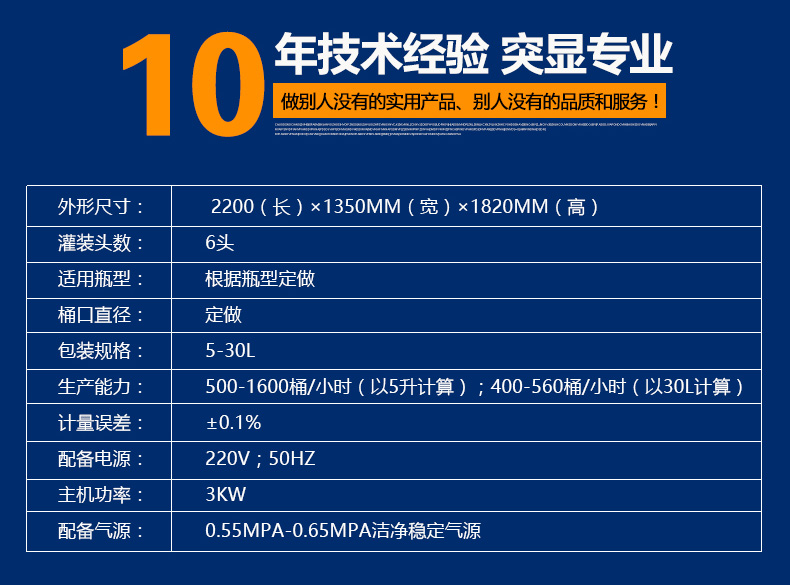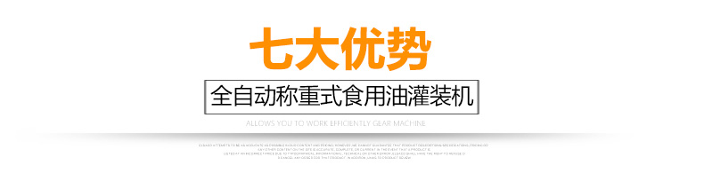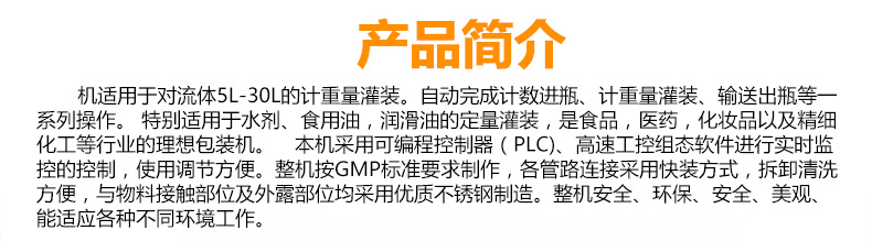 本机适用于对流体5kg-30kg的计重量灌装。自动完成计数进瓶、计重量灌装、输送出瓶等一系列操作。 特别适用于水剂、食用油,润滑油的定量灌装,是食品,医药,化妆品以及精细化工等行业的理想包装机。 本机采用可编程控制器(PLC)、高速工控组态软件进行实时监控的控制,使用调节方便。整机按GMP标准要求制作,各管路连接采用快装方式,拆卸清洗方便,与物料接触部位及外露部位均采用优质不锈钢制造。整机安全、环保、安全、美观、能适应各种不同环境工作。
