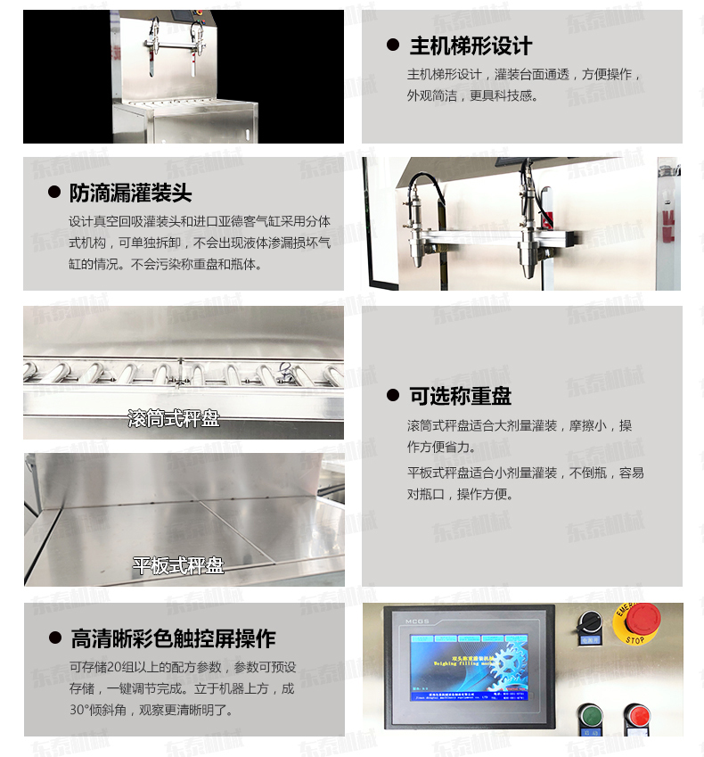 5.进口彩色触摸屏人机界面,灌装进程实现一键式操作,性能稳定。