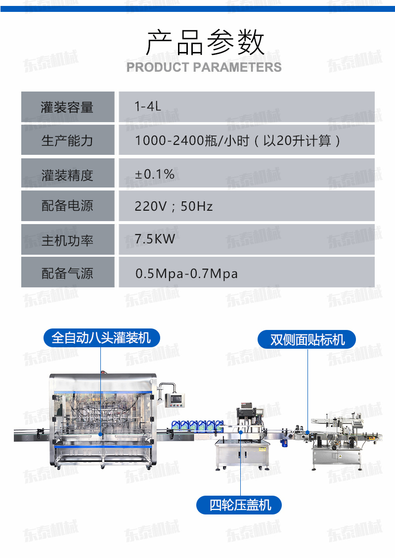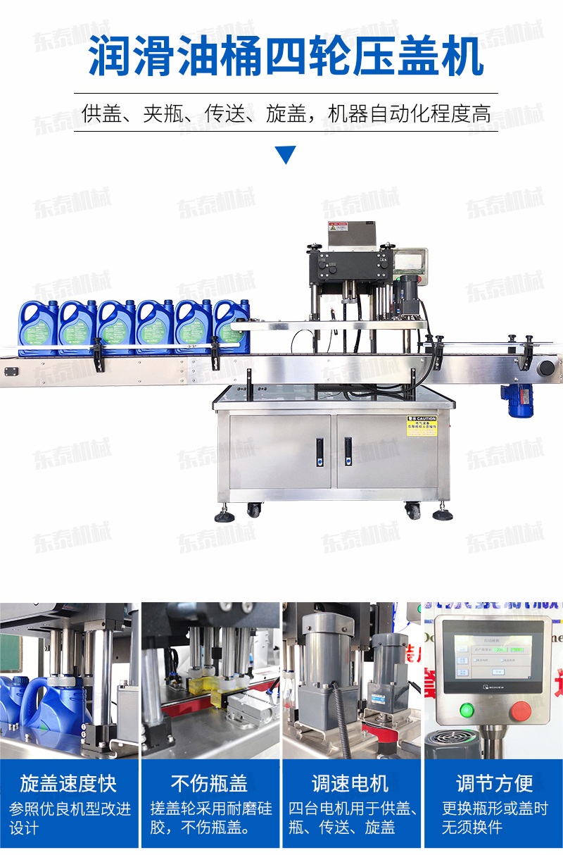 18升润滑油灌装生产线采用流量计的灌装方式,一对一系统设计,一对一系统设计,每套系统都可单独使用不受影响,设备可完成不同瓶型的自动定量;灌装头自带回吸功能,防止油品外溢,灌装机顶部带有储料箱,储料箱内部免存料设计,储料箱内要有高、低液位装置,高、低液位信号要求是24V、4~20mA,由接线端子输出。