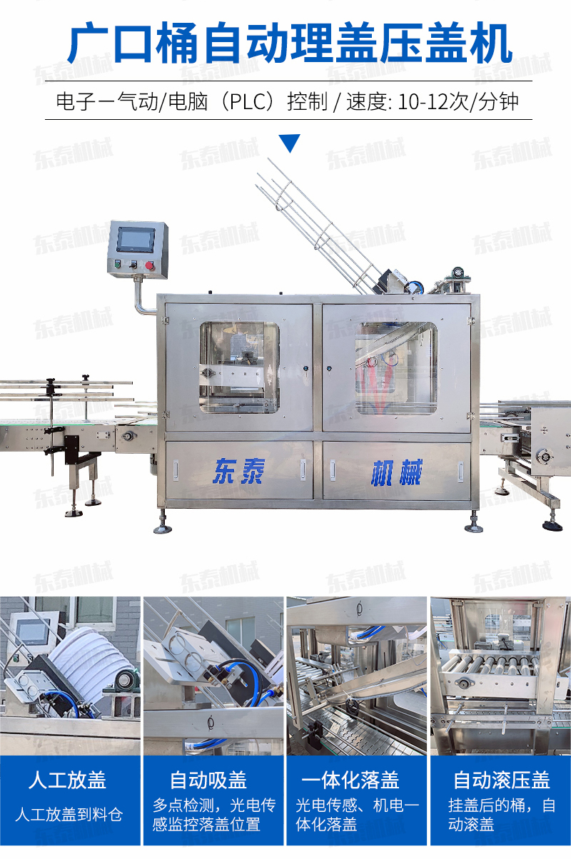 人工放盖至料仓——自动剥离——自动吸盖——自动挂盖——自动滚压盖——自动出桶——一个循环完成。