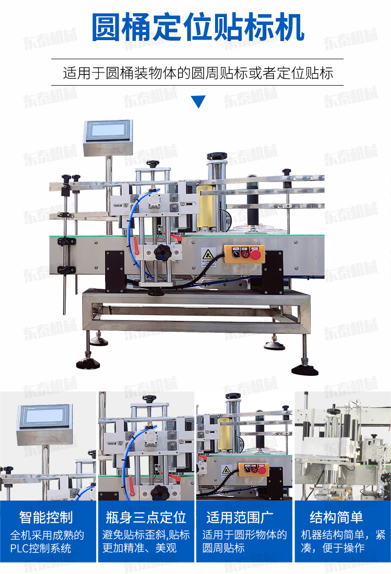全机采用成熟的PLC控制系统,使整机运行稳定、高速更加稳定的定位机构,,独特的瓶身三点定位,避免普通立式贴标机贴标时瓶底不平及瓶身不垂直误差造成的贴标歪斜,让贴标更加精准、美观、抚贴