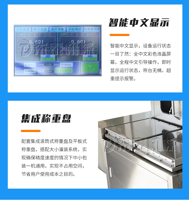 :配置集成滚筒式称重盘及平板式称重盘,搭配大小灌装系统,实现确保精度速度的情况下中小包装一机通用,实现不占用空间,节省用户使用成本之目的。